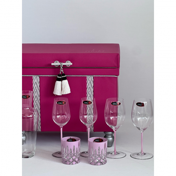今回発表した「リーデル・茶箱 ピンク」は、鮮やかなピンクの茶箱本体とマッチする、ピンクのステムが特徴的な赤ワイン、白ワイングラス 各2脚と、重厚感あるタンブラーが2脚、使いやすいサイズが特徴のデカンタがセットに全7個収納可能です。