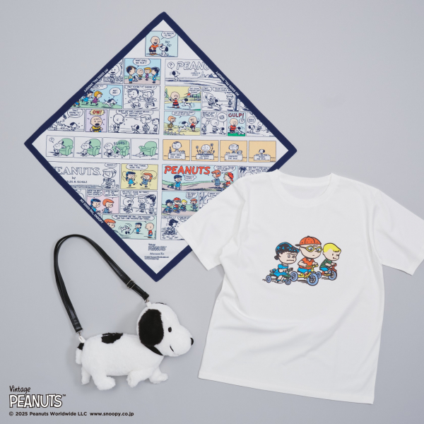 1950年にモノクロだったデザインを、あえてポップなカラーで再現した、ピーナッツギャングのTシャツとバンダナやスヌーピーバッグは、4足歩行だったころのかわいらしさをよみがえらせました。