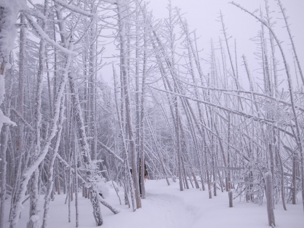 軽く吹雪いていたので北横岳登頂はパスして次の目的地へ。