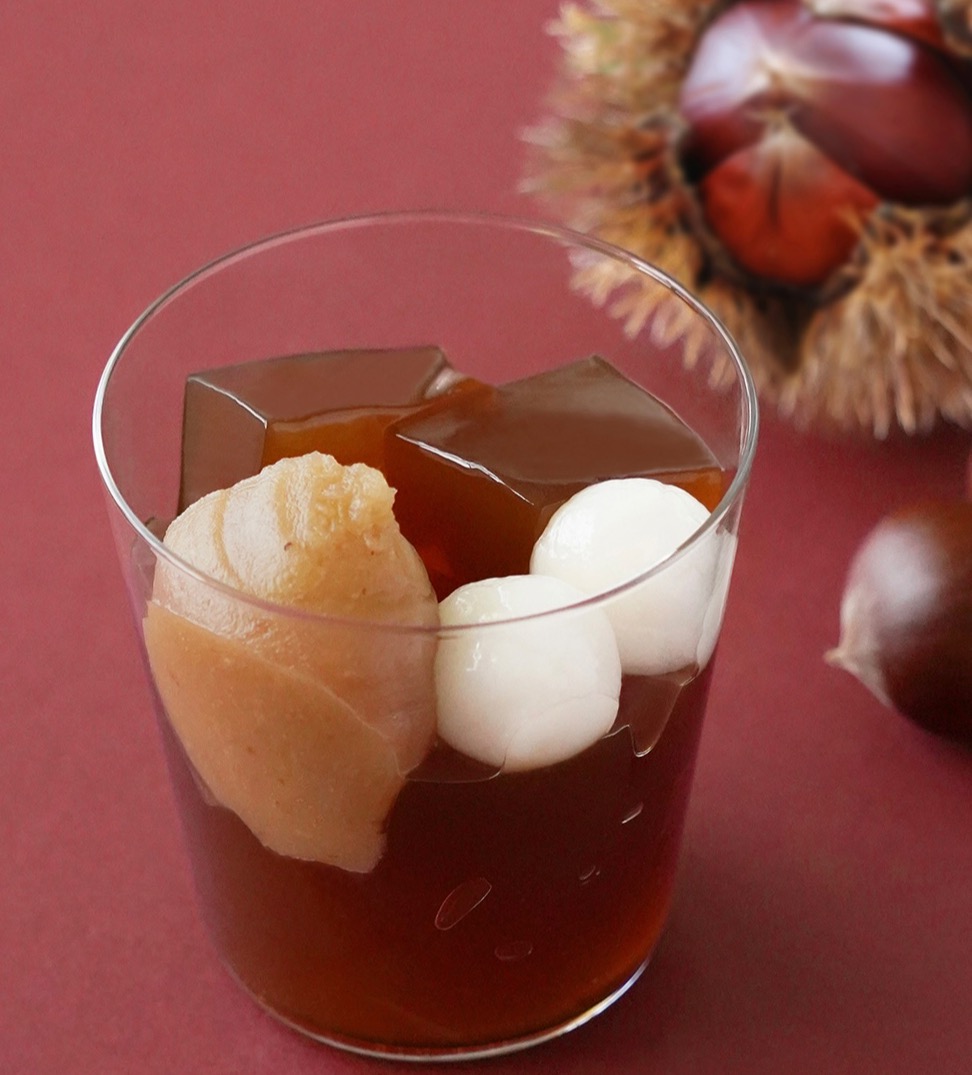 栗きんとんゼリイ🌰濃い目のほうじ茶ゼリイに、栗と鳴門金時芋を白餡で合わせた栗きんとんあんを添えています