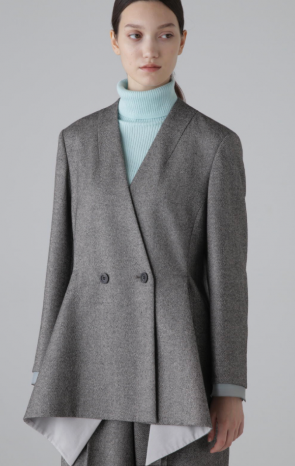 ノーカラーでボクシーなシルエットのジャケット。
