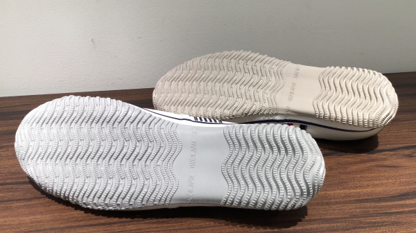 アウトソール、天然ゴムから成り弾性、耐久性、グリップ力、屈曲性に