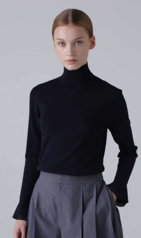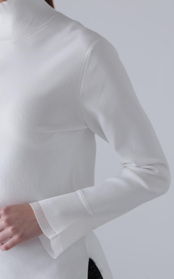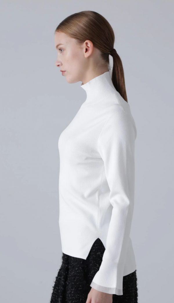 袖口にベル風のカフスのついたスタンドカラーニットです。