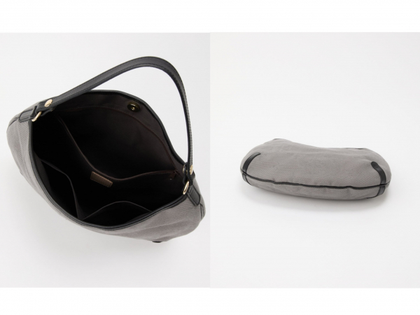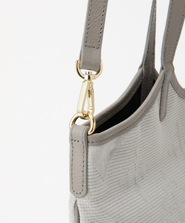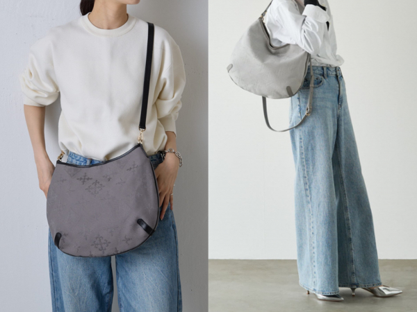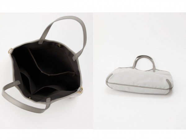 開口部のカッティングや、バッグ下部に施されたレザーがアクセントになっていて