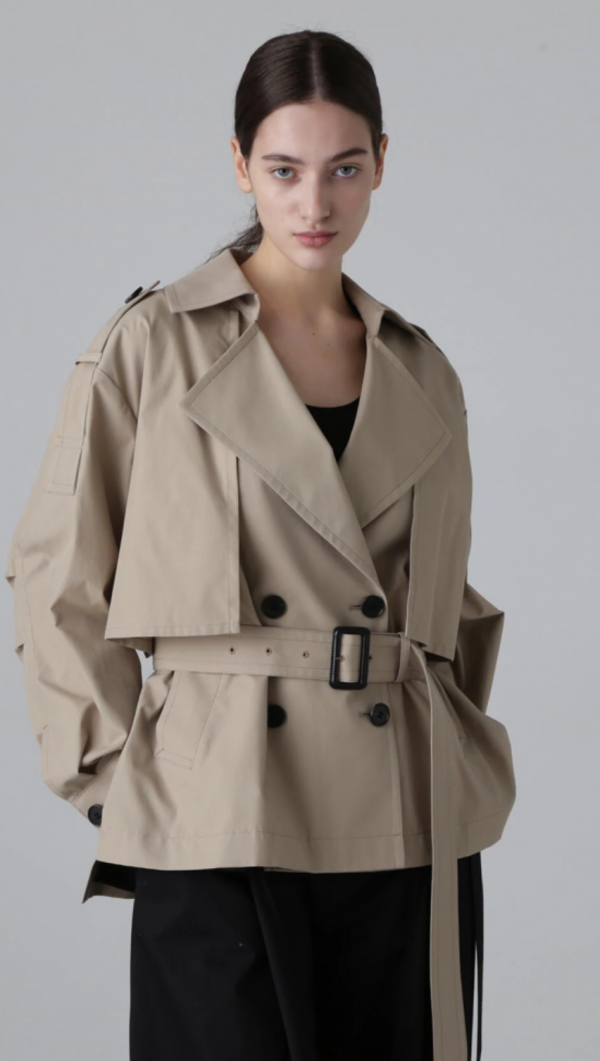 シャンブレー素材でできた軽いショート丈のトレンチジャケットです。