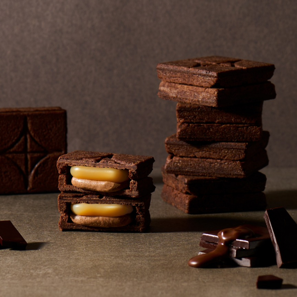 ベルギー産チョコレート(※)を使用したビター風味のチョコレート生地に、クーベルチュールのダークチョコレートを使用したチョコレートバタークリームと、口どけなめらかなバターキャラメルを挟みました。