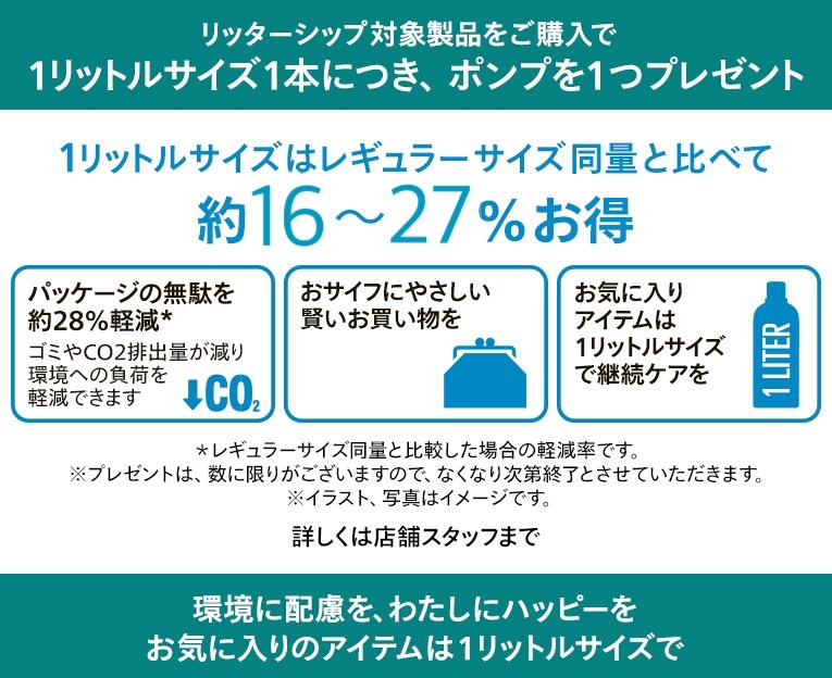 レギュラーサイズ同量と比べて約16〜27%お得な1リットルサイズをご購入いただいた方には、1本につきポンプを1つプレゼントいたします🎁