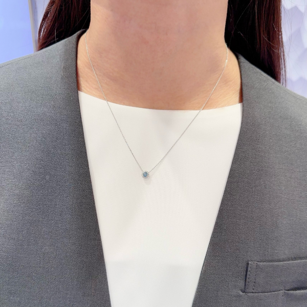 ラウンドシェイプのサンタマリアアクアマリンを1重のダイヤモンドで囲んだ