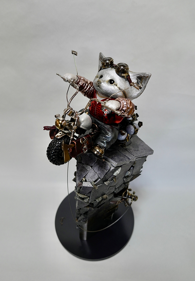 祝迫先生は、動物達がもし人間のような意志を持ったらどんな行動をするだろう、どんな格好をするだろう、という事を考え制作されています。それぞれの作品が何を考えどう行動しているのか想像を膨らませながら見て頂けるとよりお楽しみいただけます。