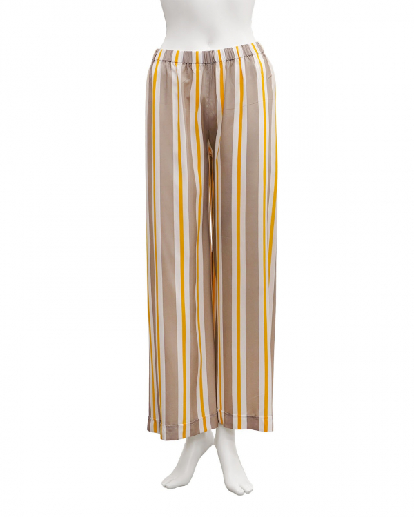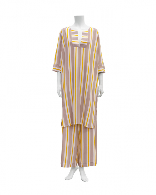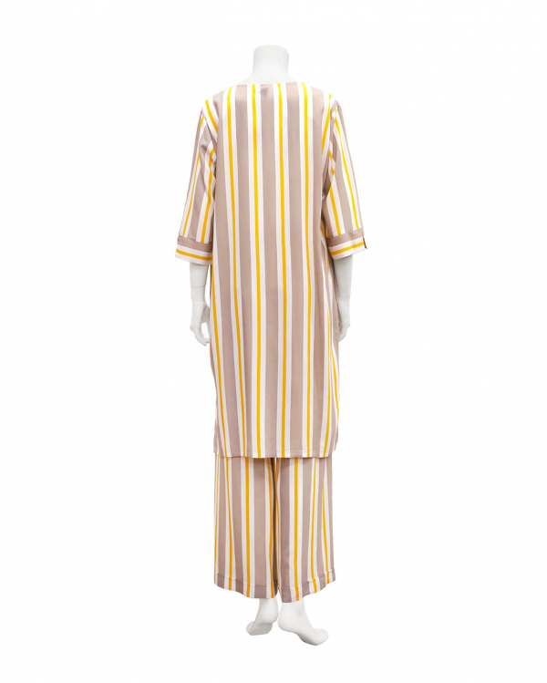 ベージュを基調にホワイト、イエローを組み合わせた縦ストライプ柄が