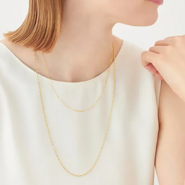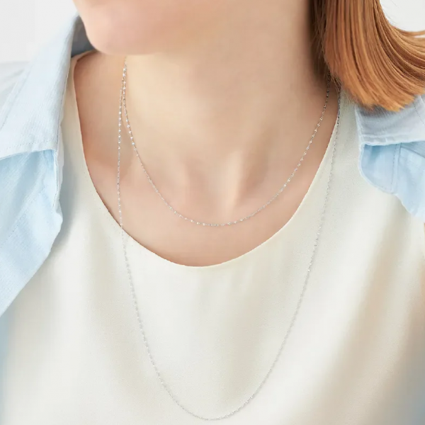 K10ホワイトゴールドのシンプルなチェーンネックレスはデザインを選ばず重ね着けできるので、お手持ちのネックレスと合わせていただくのもおすすめです✨
