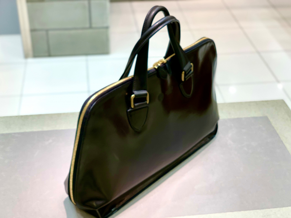 デザインとタンナーの背景を感じて頂いた後は、日本の職人が作るハンドル裏とボトムの切り目処理を見てみましょう。ハンドルは美しい曲線美を描き、ボトムは鞄を置いた時の凛とした佇まい。店頭で見てもらえれば丁寧に丈夫に作られているのが伝わるかと思います。