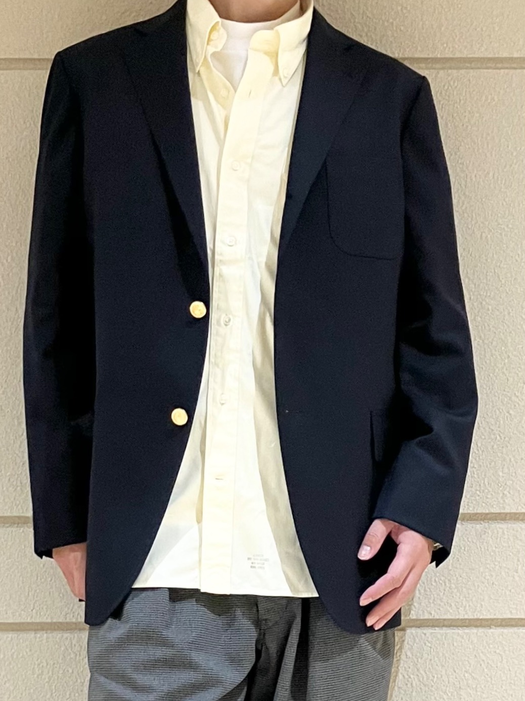 従来の定番ブレザーに比べ、軽く「ゆるさ」を重視した仕立て。ラペルも少し細くオールシーズン使える背抜き仕様。1st.ブレザーとしてオススメの一着です。