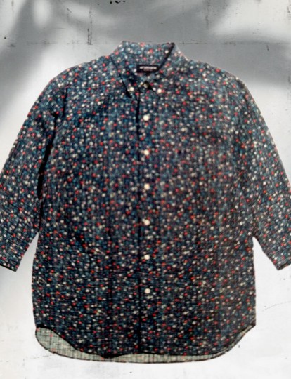 サッカー生地にカスレ調の小花柄をプリントした、夏まで使えるボタンダウンの七分袖シャツ✨