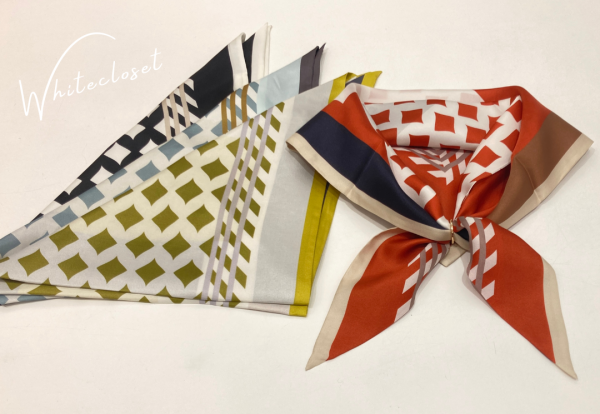 シルク素材のリバーシブルタイプの三角スカーフ。リング付きなので巻くのも簡単です。