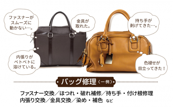 ●ファスナー修理●持ち手カット&作り替え●付け根修理●コバ塗り●ほつれ・破れ補修●パイピング修理●スナップ・ハトメ・カシメ交換●マグネット交換●D管・ナス管交換●ビス・ネジ交換●底びょう●内張り交換など