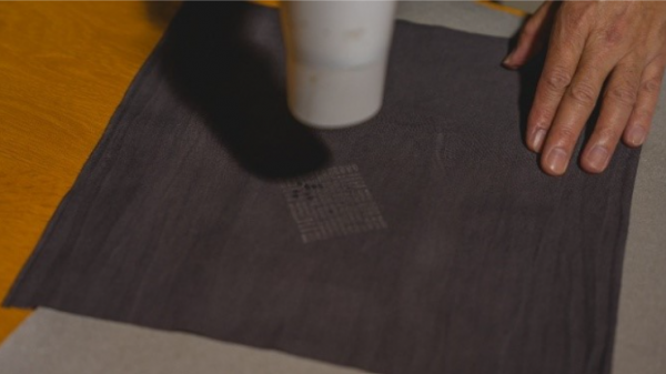お茶染めされたミニ巾着にチタン入りの糊を置き蒸すことで金茶色に色が抜ける『抜染』と