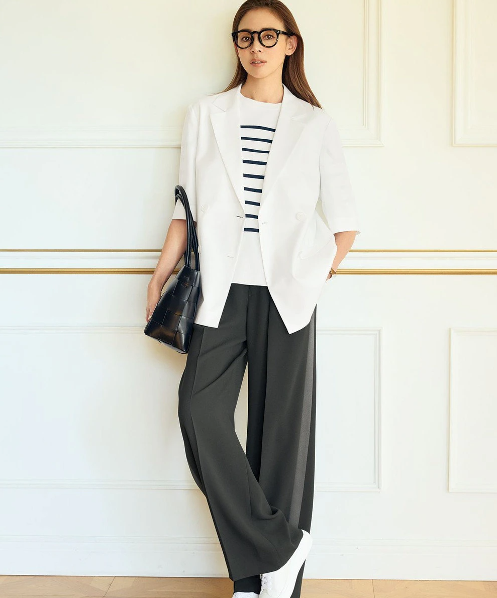 襟やラペルはきちんとしたジャケットのデザインですが、ボクシーなシルエットや長めの半袖で今年らしいゆったりとしたバランス