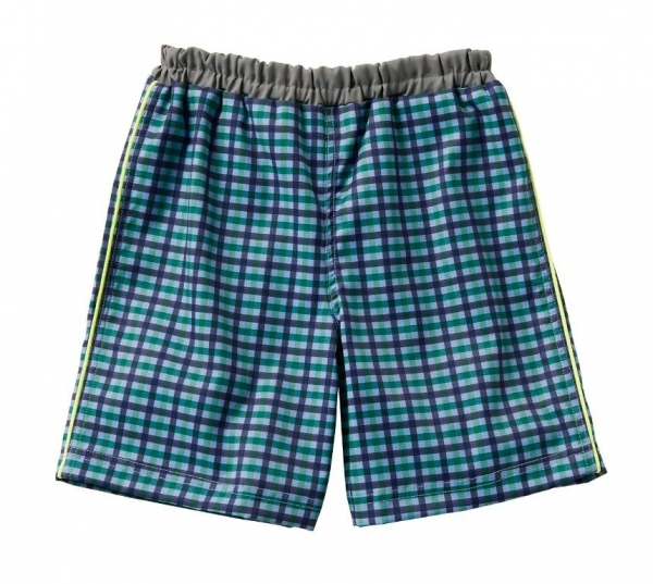 シャンブレー調青系ファミリアチェックの柄をプリントで表現した水着。