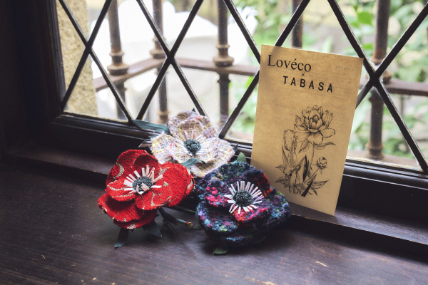 TABASAの残布を利用して製作されたコサージュは手作業で製作されるため、1点1点風合いが異なります。