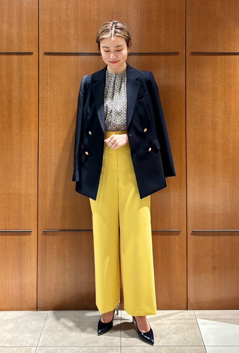 シックなネイビーブレザーに黄色のパンツを合わせたコントラストの効いたスタイリング。