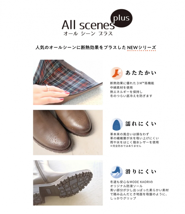 降雪地域でも大好評の〈ブルーグリップソール〉〈撥水レザー〉〈断熱中綿〉を兼ね備えた【オールシーンプラス】モデル。