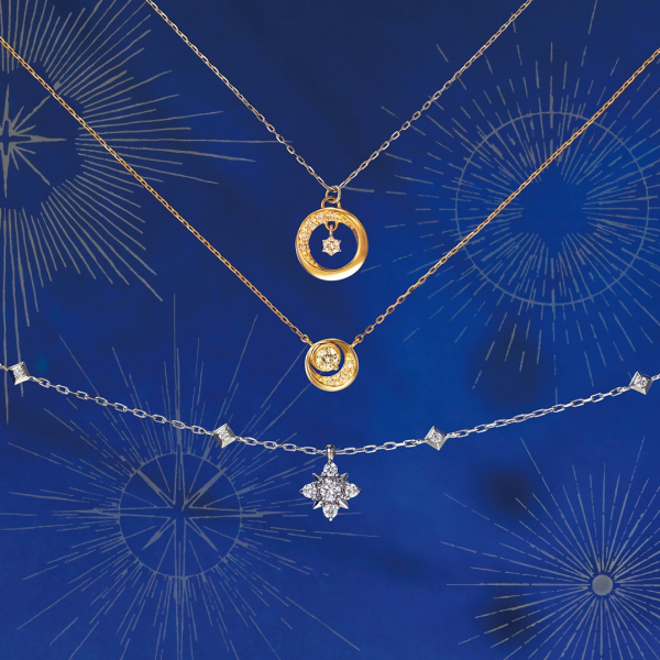 幾重にも重なる月が、ふたつの星を映すダイヤモンドを取り巻くフォルムは、