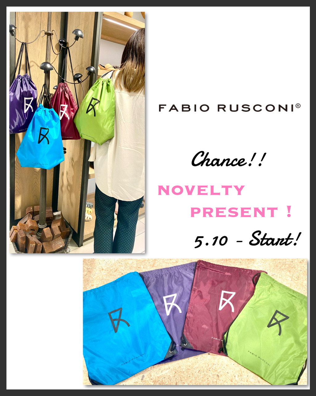5/10(wed)~期間中、ファビオルスコーニをお買い上げの方、先着10名様に“オリジナルナップサック”をプレゼント🎁