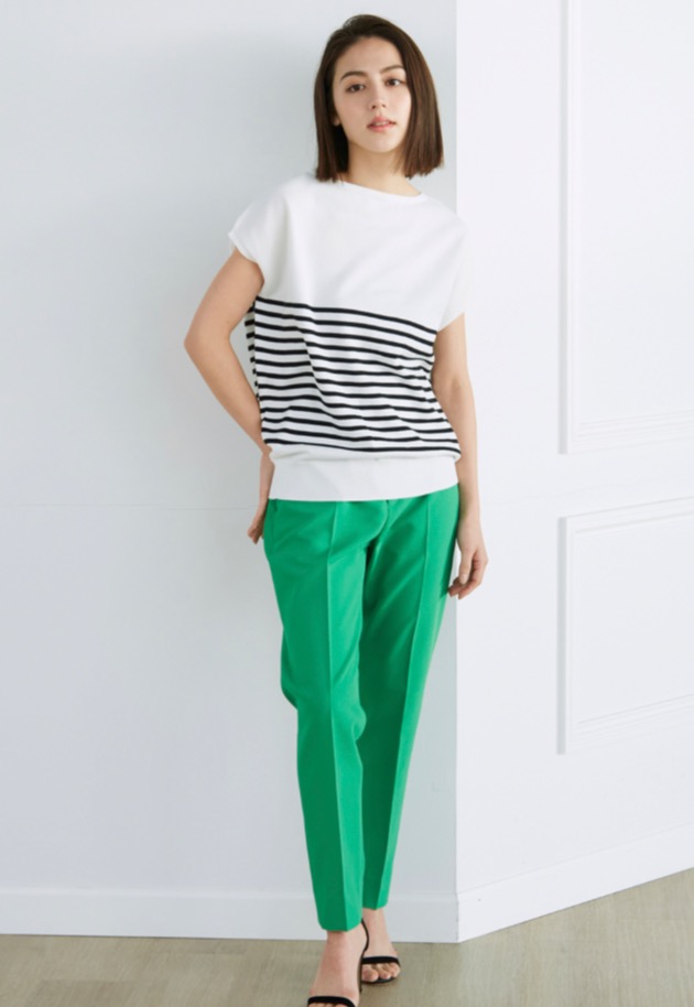 デザインはボートネックの首回りで抜け感を出し、肩先をしっかり隠す袖付けもポイント