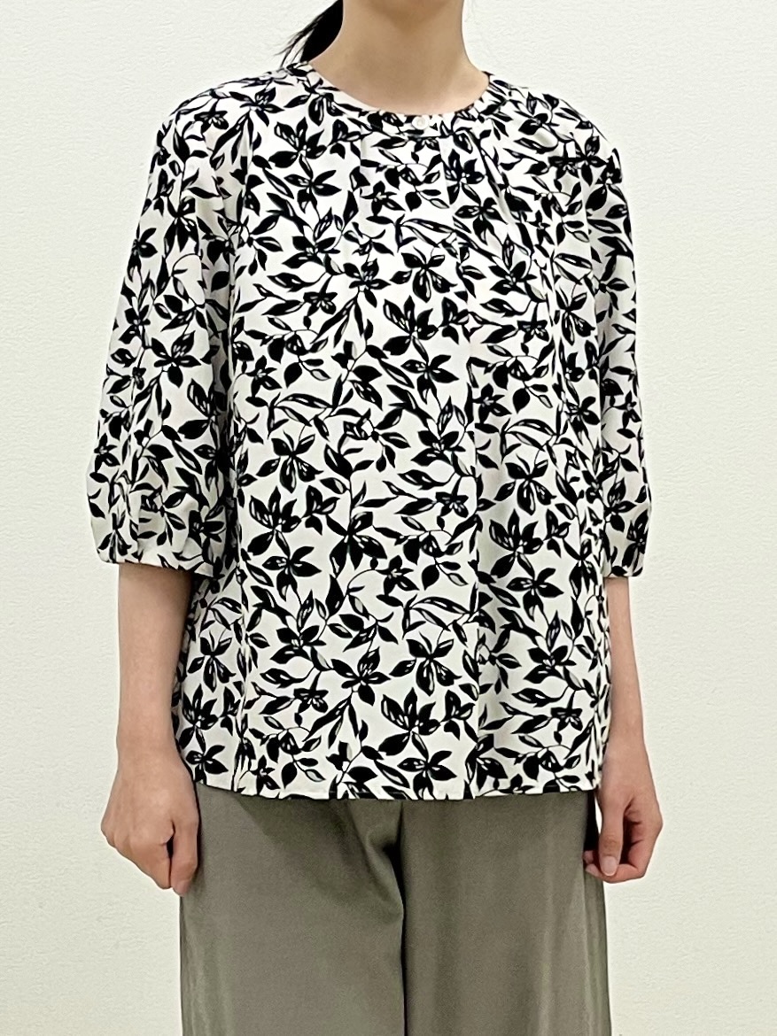 ボタニカル柄が女性らしい、クルーネックブラウス。