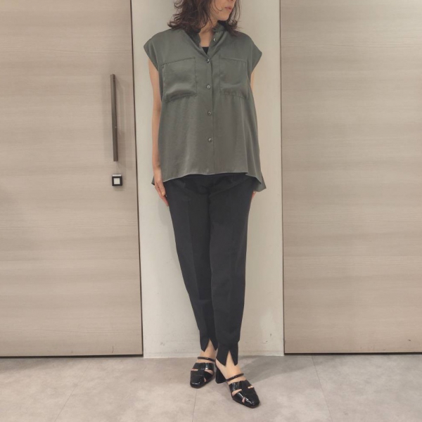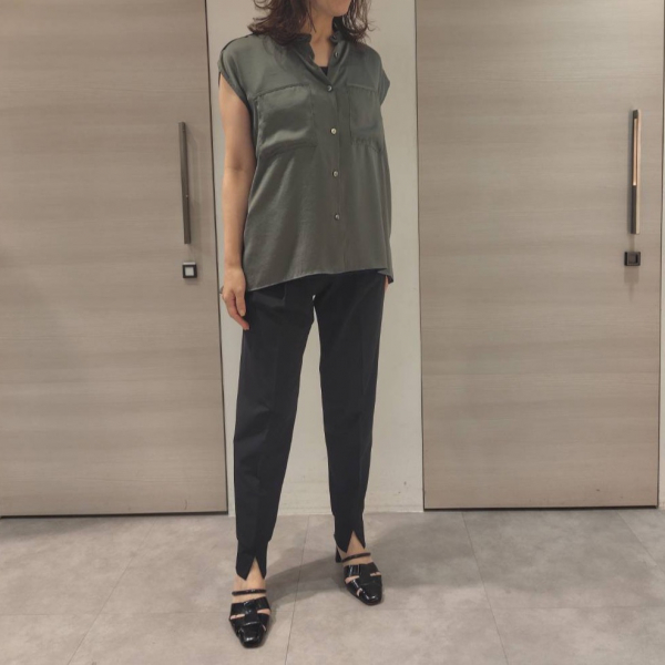 胸元のポケットデザインでカジュアルさもありながら、ツヤ感が女性らしい1枚。