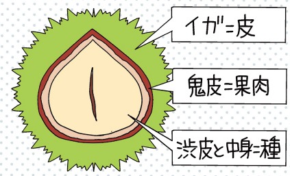 図のようにとげとげのイガが果実の皮、硬い鬼皮が果肉、そして渋皮と中身が種となります。なので鬼皮につつまれた栗をそのまま畑に植えると、先端から芽と根が伸びてきます。