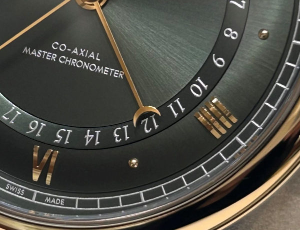日付窓ではなく日付リングのアラビア数字を三日月形の針が指し示すポインターデイト