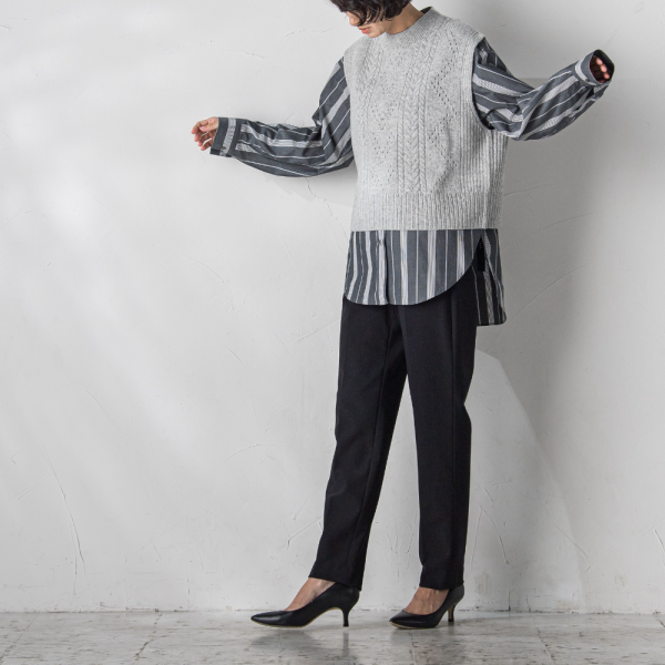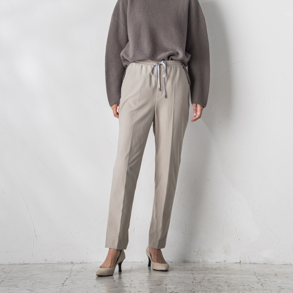 ベージュ着用。ウエストは総ゴムのイージーテーパード。