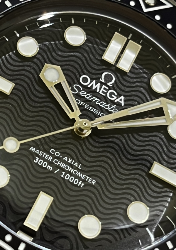 文字盤にもベゼル同様アルミ素材を使用しておりレーザーで波模様が描かれています。文字盤の波模様こそが昔から受け継がれているダイバー300Mのディティールの一つです。また日付け表示が無い分スッキリとしており文字盤のデザインをより楽しむ事ができます。