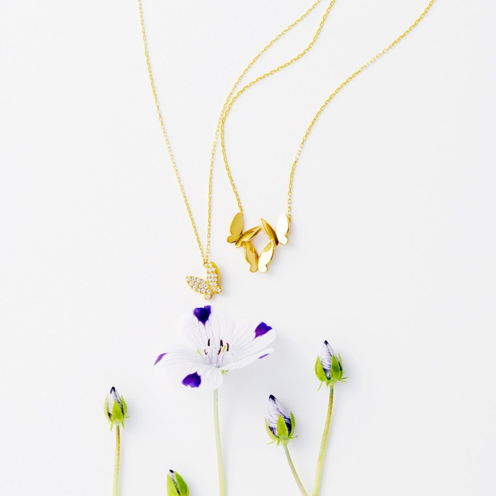 蝶が軽やかに集い胸元にとまっているような、遊び心が感じられるデザイン。フォルムとバランスを緻密に構築し、年代を問わず楽しめます。