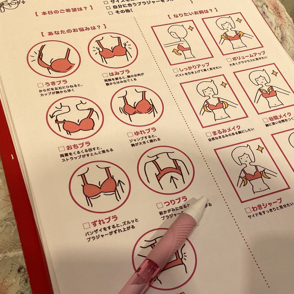 お客様の現在のお悩みや、なりたいお胸のシルエットなどをお伺いしつつ、