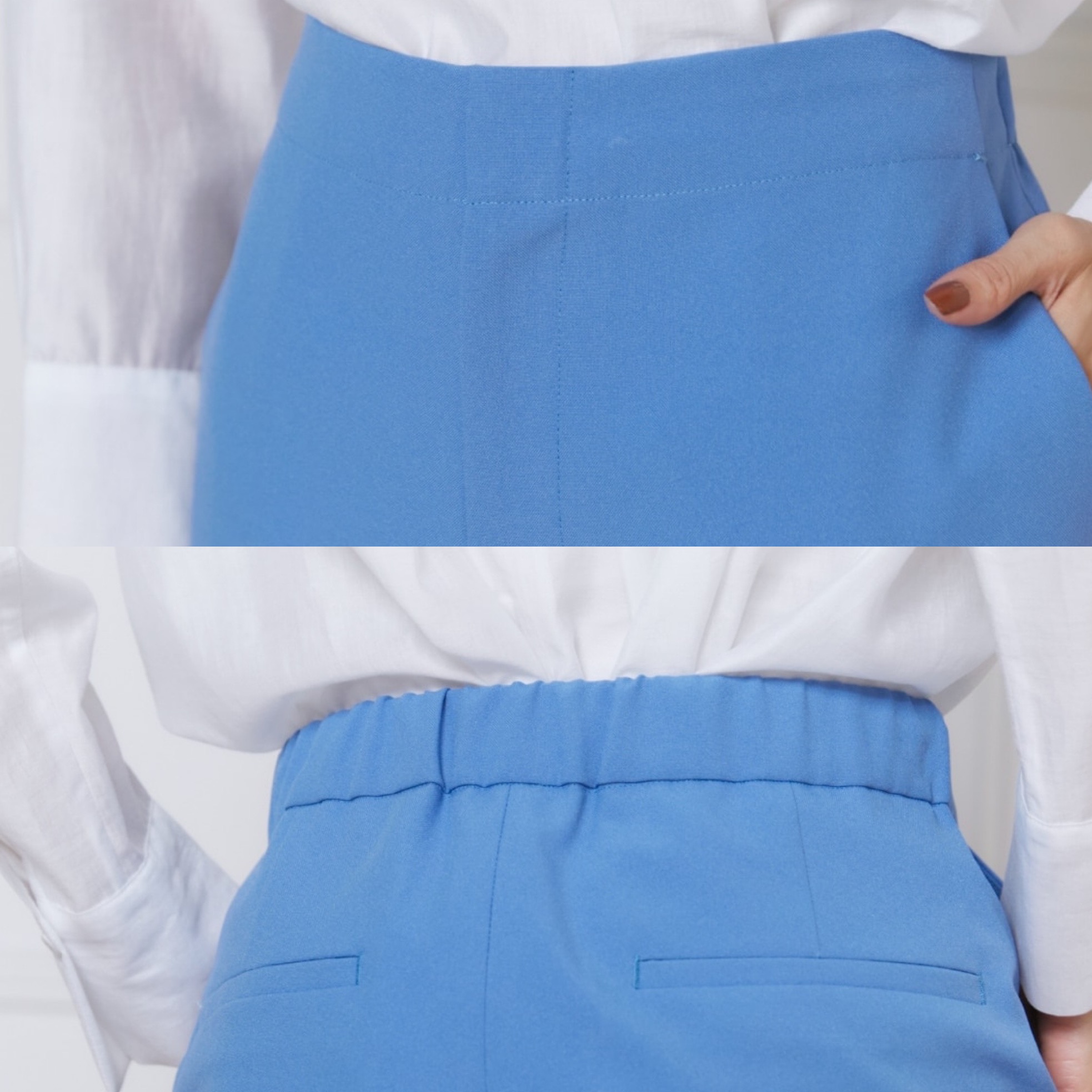 太ももあたりはすっきりと、裾に向かって程よく広がったセミフレアシルエット。膝位置で絞ることですっきりとした印象に。