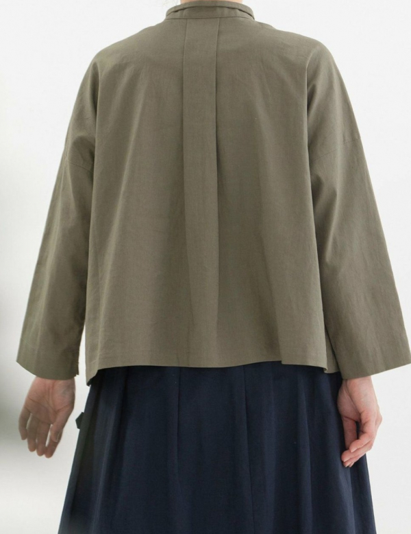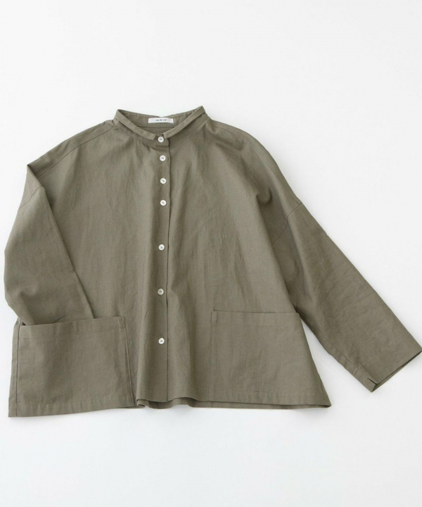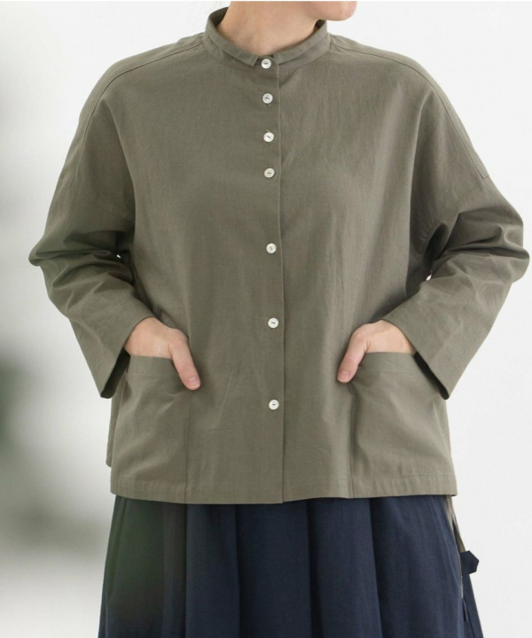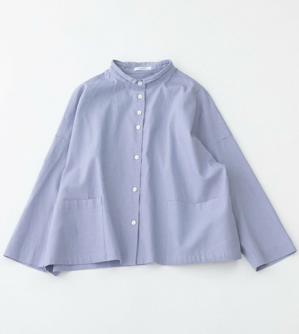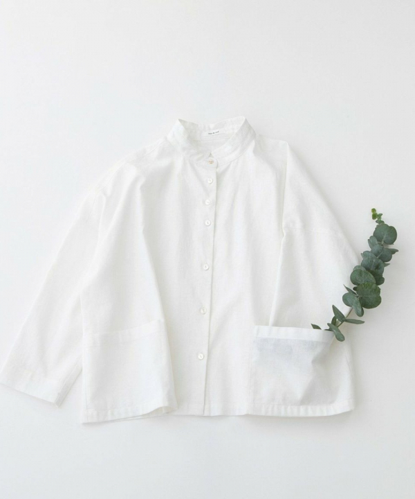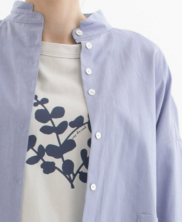 変形スタンドカラーの羽織にもなるワイドなシャツ。