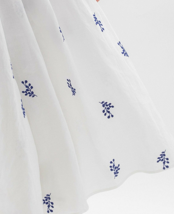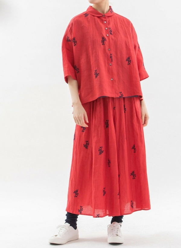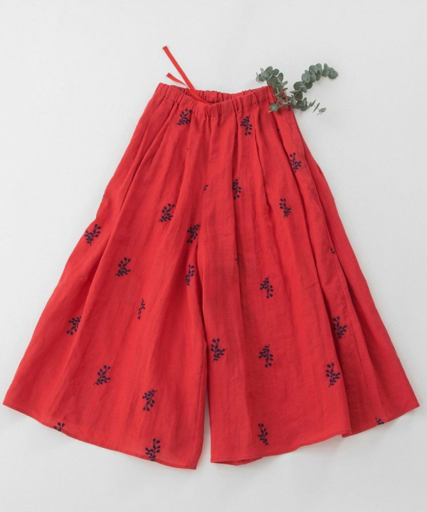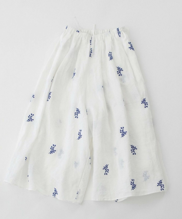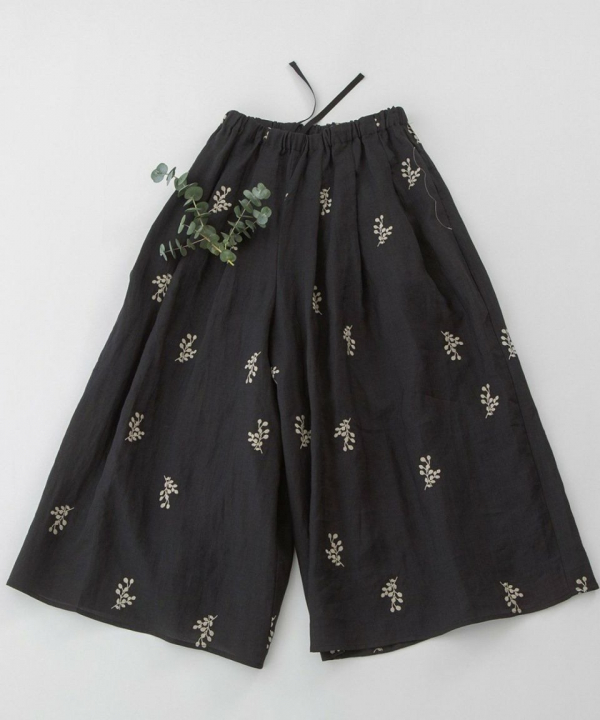 ユーカリモチーフ刺繍のオリジナルテキスタイルのキュロット。
