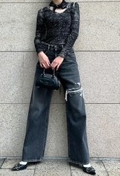 大胆なダメージ加工が抜け感を演出し、透け感のあるトップスや