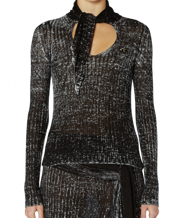 14ゲージのリブ編みで仕立てたボウタイ付きの長袖ニット