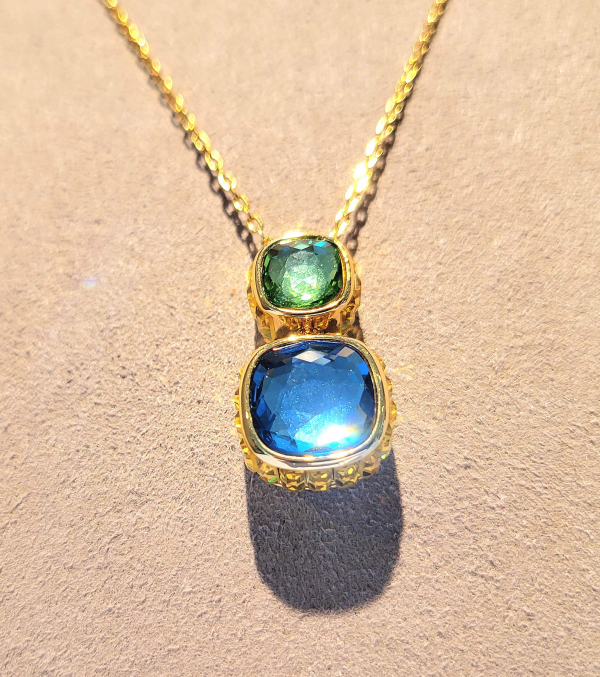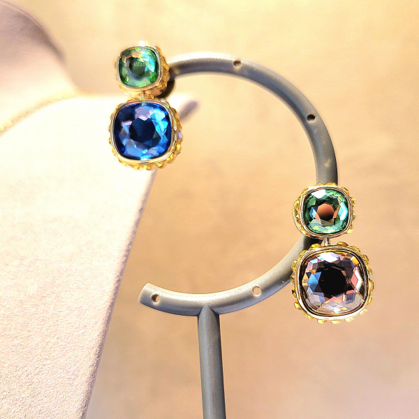 ゴールドトーンにブルー、ピンク、グリーン、イエローの色鮮やかなクリスタルが光り輝きます💎✨