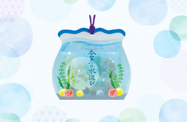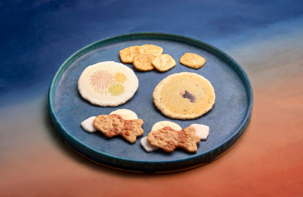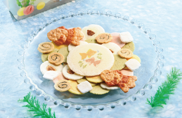 金魚鉢を意匠したパッケージに、金魚の絵柄のえびせんべい、夏季限定のだだちゃ豆味・夏みかん味のえびせんべいなどを詰め合わせました。涼やかなパッケージで、お部屋に飾るのもおすすめです🌞