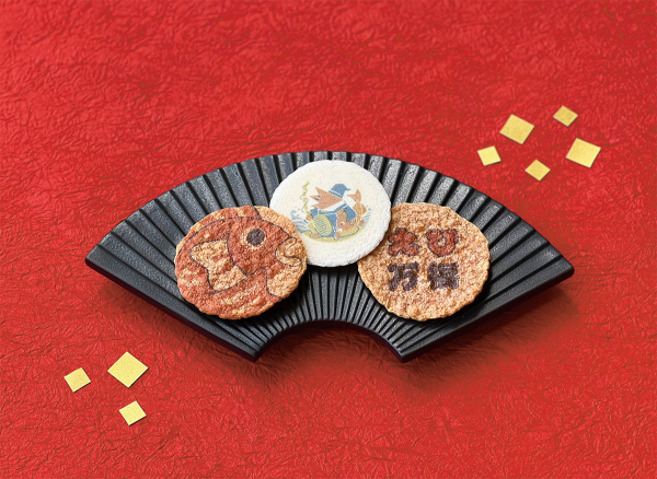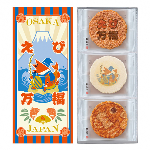 真ん中のえびせんべいには桂新堂のキャラクターえびくんとえびす様を用いた絵柄がプリントされています!