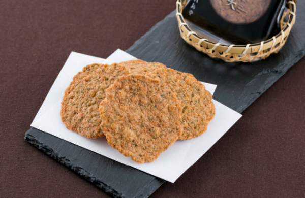 粉末ソース、あおさ、紅しょうがを練り込み、こんがりと揚げた「お好み焼き」味のえびせんべい。